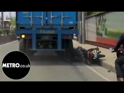 ويظهر في الفيديو الذي سجل في الفبين سقوط سائق الدراجة وصعود عجلة الشاحنة فوق رأسه، ولحسن حظه أنه كان يرتدي خوذة تحطمت بالكامل.