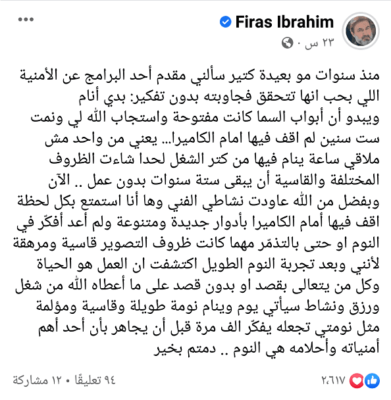 وكتب الفنان “فراس ابيراهيم” عبر حسابه في “فيسبوك” “منذ سنوات سألني مقدم أحد البرامج عن الأمنية اللي بحب إنها تتحقق فجاوبته بدون تفكير: بدي أنام”، مضيفاً “يبدو أن أبواب السما كانت مفتوحة واستجاب الله لي ونمت ست سنين لم أقف فيها أمام الكاميرا”.