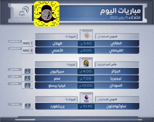 جدول مباريات اليوم يوم الثلاثاء 11 كانون الثاني (يناير) 2022
