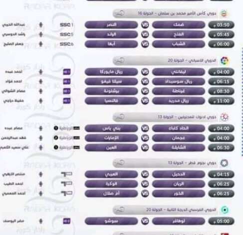 فيما يلي جدول بأهم مباريات يوم السبت 8 كانون الثاني 2022