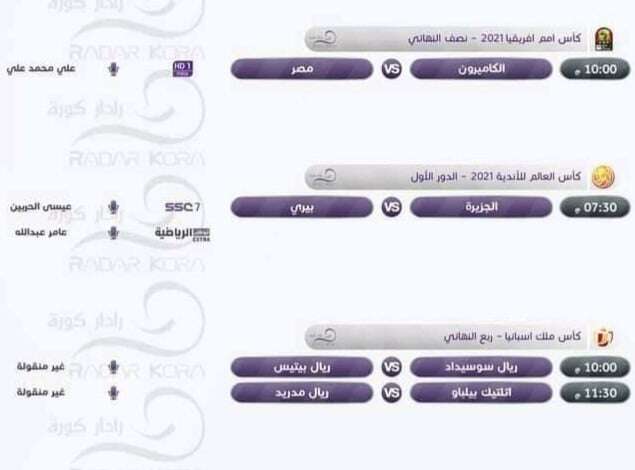 يشهد يوم الخميس 3 شباط (فبراير) الجاري عدة مباريات في مختلف دول العالم أبرزها مباراة مصر والكاميرون في الدور النصف النهائي لبطولة كأس أفريقيا 2022، بالإضافة لمباريات في كأس إسبانيا “كوبا دي ري”.