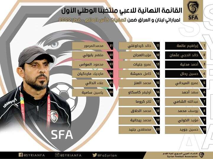كشف مدرب منتخب سوريا لكرة القدم غسان معتوق عن قائمة منتخب نسور قاسيون لمواجهة منتخبي الأرز اللبناني وأسود الرافدين العراقي.
