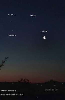 أتاحت السماء فرصة رائعة لمحبي التقاط الصور وعلم الفلك لمشاهدة ظاهرة فلكية نادرة حدثت، صباح يوم الاثنين الباكر، تمثّلت باقتران هلال القمر مع 3 كواكب وهي الزهرة والمريخ وزحل، في لوحة فضائية تمكن البعض من مشاهدتها بالعين المجردة.