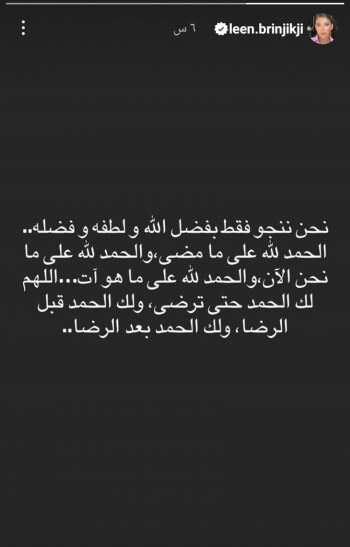 وعبر خاصية “ستوري” كتبت مصممة الأزياء “لين برنجكجي”: “نحن ننجو فقط بفضل الله ولطفه وفضله، الحمدلله على ما مضى، والحمد لله على ما نحن الآن، والحمد لله على ما هو آت … ”