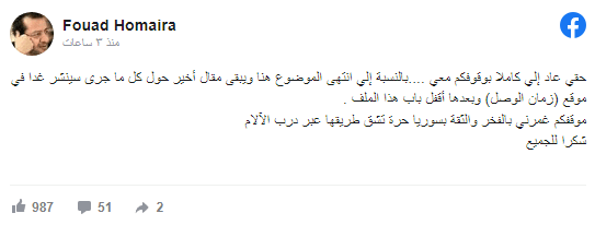 من جهته، نشر الكاتب حميرة عبر فيسبوك، أنه سيتحدث عن الموضوع بتفاصيله ضمن مقال سينشره غدًا، الخميس، في موقع زمان الوصل، وبعدها سيقفل ملف النزاع من ناحيته.