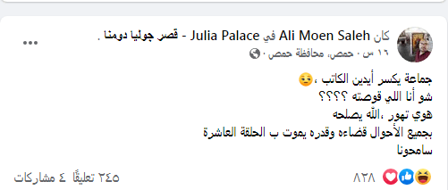 ليرد بدوره، المؤلف “علي معين صالح” على التعليقات عبر “فيسبوك”، قائلاً: “جماعة يكسر أيدين الكاتب.. شو أنا اللي قوصته ؟؟.. هوي تهور الله يصلحه.. بجميع الأحوال قضاءه وقدره يموت بالحلقة العاشرة سامحونا”.
