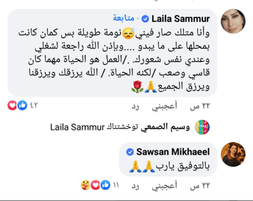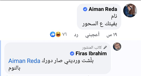 من جهتها، رحبت الفنانة “سوسن ميخائيل” بعودة “ابراهيم” إلى الدراما، متمنيةً له التوفيق، في حين علق الفنان “أيمن رضا” على المنشور بكلمات بين المزاح والسخرية وكتب موجهاً كلامه لـ”إبراهيم”: “نام بفيقك ع السحور”، ليرد عليه الأخير: “بلشت ورديتي صار دورك بالنوم”.