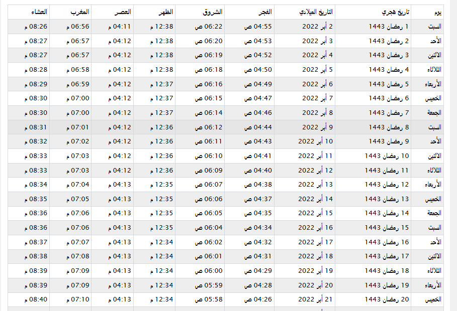 نقدم لكم تقويم شهر رمضان خلال 30 يوماً، متضمناً أوقات الصلاة والسحور والإفطار: