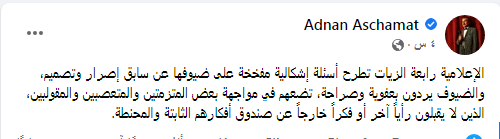 كما اعتبر الفنان أبو الشامات في منشور له عبر صفحته في فيسبوك، أن الزيات تتعمد إحداث كل ذلك الضجيج الإعلامي خلال طرح أسئلة جدلية على ضيوفها قائلاً: الإعلامية رابعة الزيات تطرح أسئلة إشكالية مفخخة على ضيوفها عن سابق إصرار وتصميم.