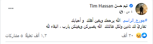 وتوجه الفنان تيم حسن بالتعازي لعائلة ومحبي الراسي، وكتب: الله يرحمك ويعين أهلك وأحبابك.. تعازيّ لك نادين ولكل عائلتك الله يصبركن ويعينكن يارب، البقاء لله.