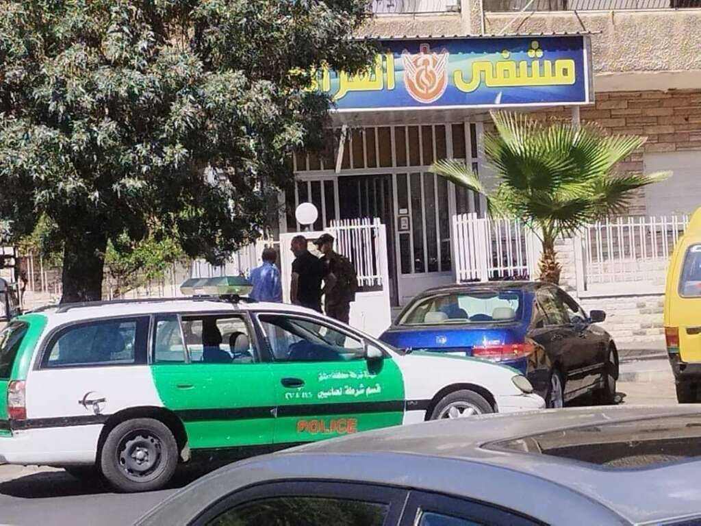 ونشرت صفحات على وسائل التواصل صوراً لعملية تشميع الباب الرئيسي للمشفى ” الاسعاف ” بالشمع الاحمر من قبل مخفر شرطة العباسيين في دمشق