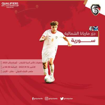ويأتي ذلك بعد أن حقق المنتخب السوري الفوز على الصين تايبيه بنتيجة 1-0 السبت الماضي خلال افتتاحه تصفيات كأس آسيا للشباب في الأردن.