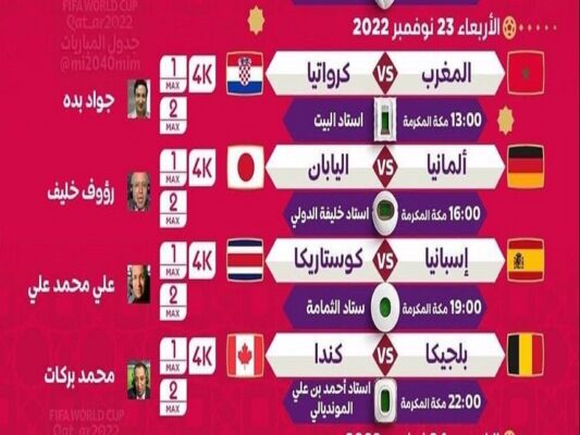 نقدم لكم جدول مواعيد مباريات يوم الأربعاء 23 تشرين الثاني (نوفمبر) 2022 أبرزها مباريات بطولة كأس العالم لكرة القدم المقامة حالياً في قطر حتى 18 كانون الأول المقبل.