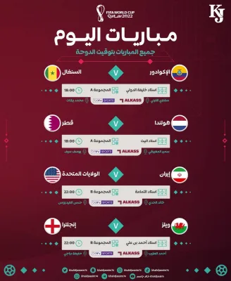 نقدم لكم جدول مباريات يوم الثلاثاء 29 تشرين الثاني الجاري أبرزها مباريات الجولة الأخيرة من دور المجموعات للمجموعة الأولى والثانية لمونديال قطر كأس العالم 2022