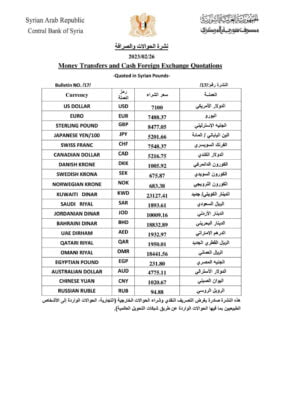 أعلن مصرف سوريا المركزي عن نشرة الصرافة و المصارف ( حوالات ويسترن يونيون إلى سوريا ) اليوم الأحد 26 شباط 2023 بزيادة 100 ليرة عن نشرة الخميس