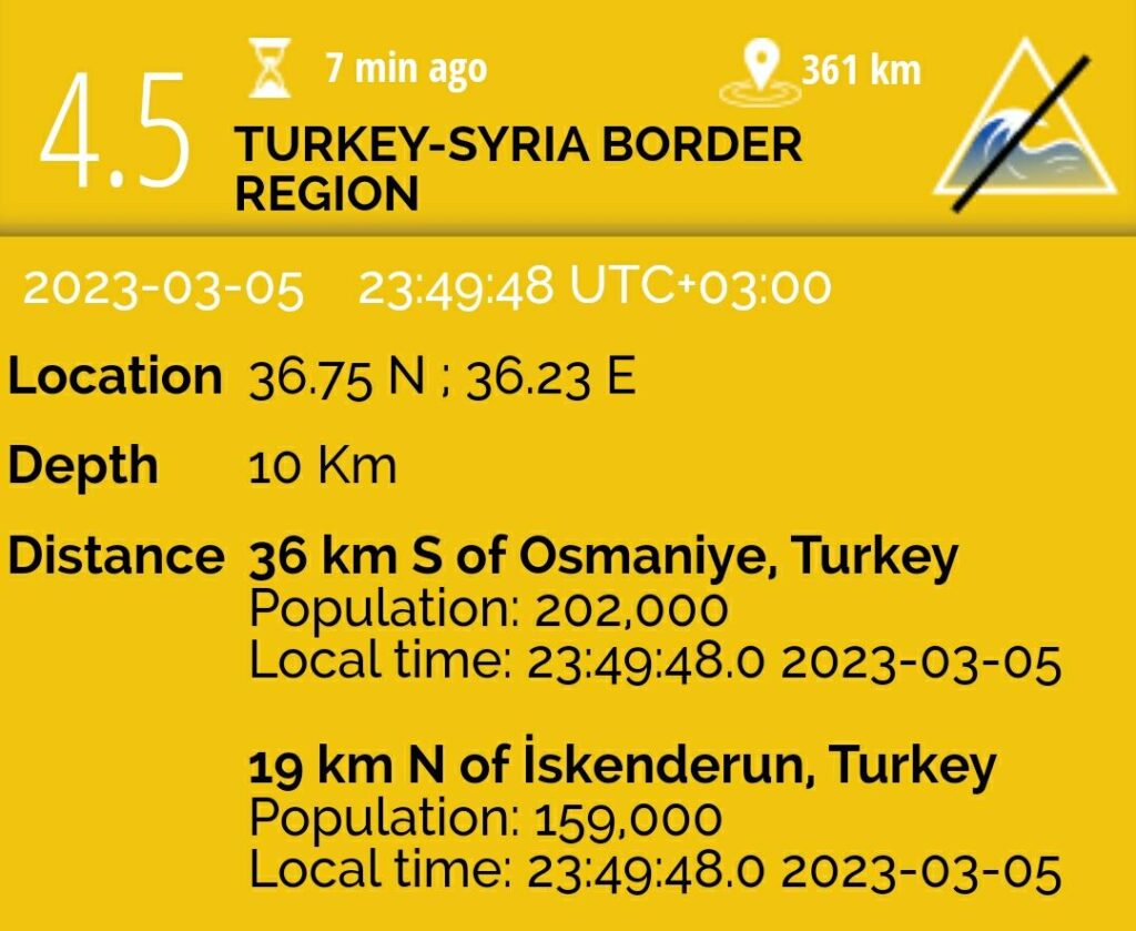 وأن مركز الهزة هو لواء اسكندورن ” هاتاي ” في تركيا