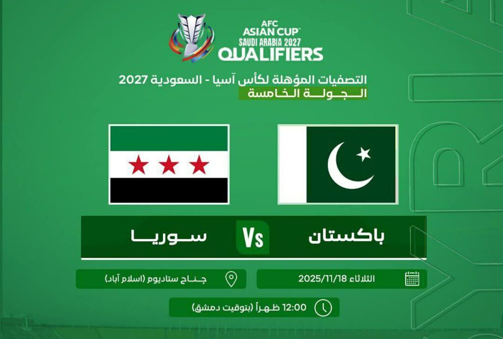 يستعد المنتخب السوري لخوض مواجهة مهمة أمام منتخب باكستان غدًا الثلاثاء 14 نوفمبر 2025، ضمن منافسات الجولة الخامسة من التصفيات المؤهلة لكأس آسيا 2027. وتقام المباراة على ملعب جِناح في العاصمة الباكستانية إسلام آباد، عند الساعة 12:00 ظهرًا بتوقيت دمشق (2:00 ظهرًا بتوقيت باكستان).