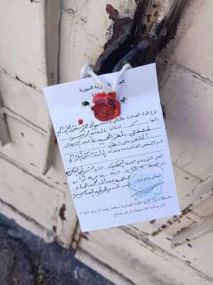 ونشرت صفحات على وسائل التواصل صوراً لعملية تشميع الباب الرئيسي للمشفى ” الاسعاف ” بالشمع الاحمر من قبل مخفر شرطة العباسيين في دمشق